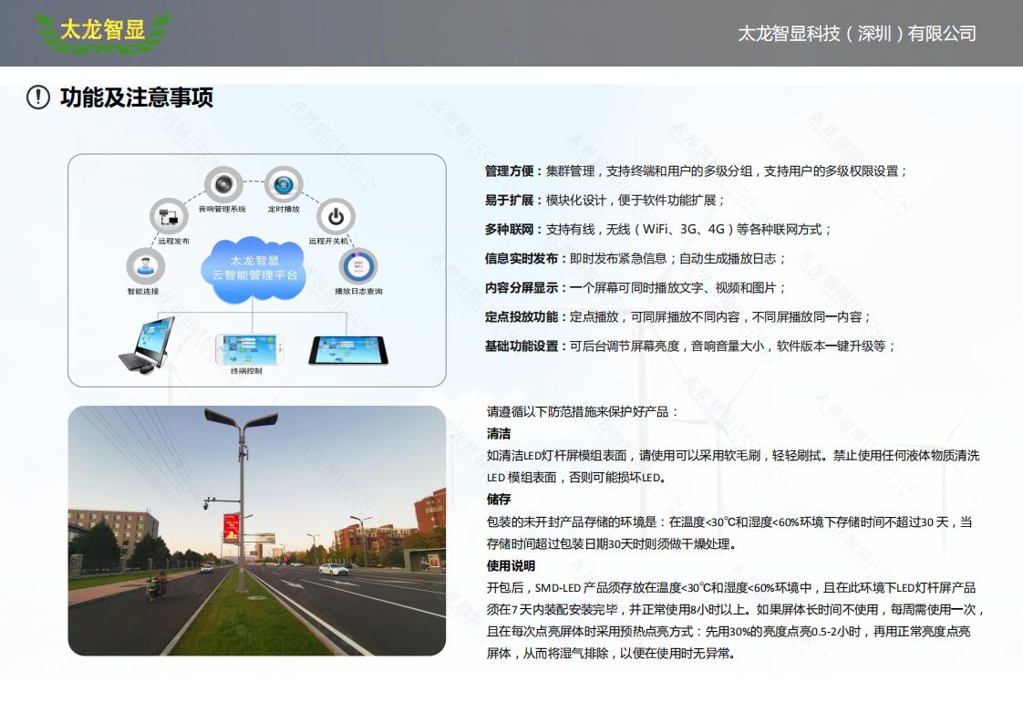 P3.846LED燈桿屏,顯示尺寸為800*1600mm,是一款依托互聯(lián)網(wǎng),物聯(lián)網(wǎng)等信息技術(shù)為基礎(chǔ),作為智慧城市的顯示終端,能夠?qū)崿F(xiàn)遠(yuǎn)程集群管理操控的戶外終端設(shè)備.箱體采用鋁材質(zhì),箱體輕薄,安裝簡(jiǎn)單操作方便,適配于不同樣式、高度的智慧燈桿。它具備外觀靚麗、輕盈、時(shí)尚、亮度高、高顯色系數(shù)、防水、防爆、防雷等特點(diǎn)的視頻播放裝置,全鑄鋁智慧燈桿屏適用于各高速、交通要道、景區(qū)、賽事場(chǎng)館等場(chǎng)景。